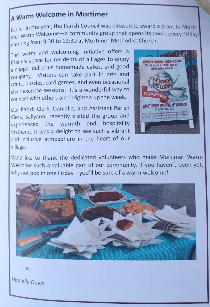 As we have grown in size, we are now in desperate need of more help each week as we cannot turn people away from a Warm Welcome group. We need help to set up and pack up, to carry chairs and tables etc. We are of the older age and suffering with back problems, so this isn’t an easy task. You would need to be at the hall by 9.00am prompt. Packing up no earlier or later than 12.30. We need more help to serve tea/coffee cake etc. to wash up during the morning to make sure clean cups are provided ongoing throughout the morning. Also, people to chat to our guests.